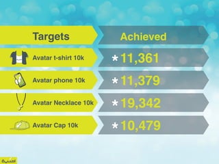 The December summary report shows that the company exceeded its targets for virtual Avatar merchandise sales including t-shirts, phones, necklaces and caps. It also surpassed its goals for Umniah's virtual world presence, a virtual house skin, news articles/stamp views, and redirections to Umniah's fun website. All key performance indicators were above the targeted levels set for December.