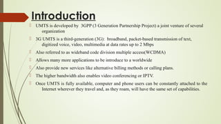 Universal Mobile Telecommunication System (UMTS) is a third-generation (3G) mobile network technology developed by the 3GPP, facilitating broadband data transmission of up to 2 Mbps for text, voice, and multimedia services. It aims to create a global standard for mobile communication, overcoming compatibility issues between earlier generations and enabling continuous internet access. The architecture includes user equipment, the UMTS terrestrial radio access network (UTRAN), and a core network, allowing for circuit and packet-switched communications.