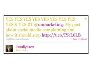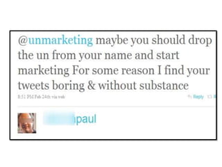 This document discusses engagement strategies for marketing in the digital age. It touches on using social media to build relationships with customers, the challenges of measuring success and returns on investment for marketing efforts online, and dealing with trolls and negative engagement on platforms. The overall message is that traditional models of marketing and branding are changing and new approaches are needed to connect with audiences in meaningful ways through social media and digital interactions.