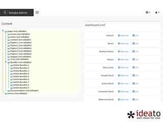 Il documento spiega come assemblare i componenti del Symfony CMF per creare un CMS funzionale in tempi brevi. Viene fornita una panoramica delle dipendenze necessarie nel file composer.json e della struttura dei vari bundle. Inoltre, si evidenziano le potenzialità del CMF, la sua maturità e la sua applicabilità a progetti esistenti.