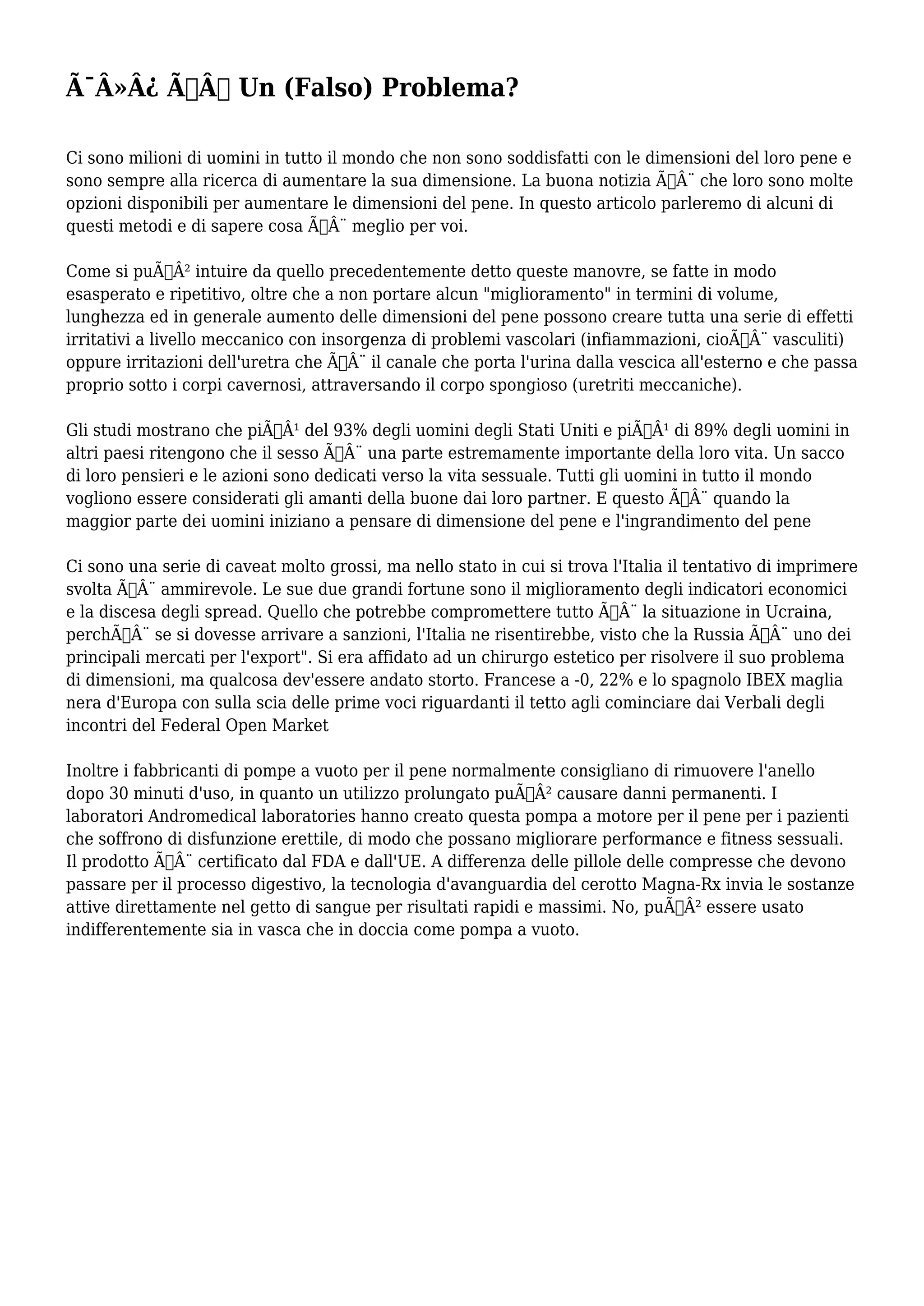 Il documento discute la frustrazione di molti uomini riguardo le dimensioni del pene e le opzioni disponibili per aumentarne la dimensione. Viene evidenziato che molte delle tecniche di ingrandimento possono portare a effetti collaterali e che la maggior parte degli uomini considera il sesso un aspetto importante della vita. Infine, si menzionano prodotti e metodi naturali per il potenziamento sessuale, sottolineando che non tutti i metodi sono efficaci o privi di rischi.