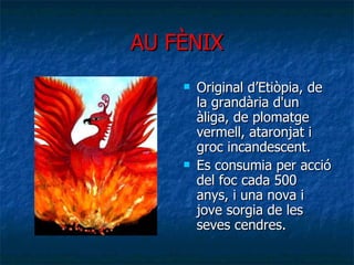 AU FÈNIX Originald’Etiòpia, de la grandària d'un àliga, de plomatge vermell, ataronjat i groc incandescent. Es consumia per acció del foc cada 500 anys, i una nova i jove sorgia de les seves cendres.