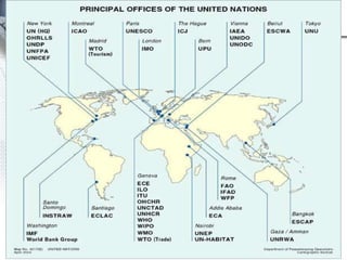 The United Nations was established in 1945 to replace the League of Nations with the goals of maintaining international peace and security, developing friendly relations among nations, and promoting social progress, better living standards, and human rights. The six main organs of the UN are the General Assembly, Security Council, Economic and Social Council, International Court of Justice, Secretariat, and Trusteeship Council. The UN aims to solve international problems, formulate policies on social and economic issues, and act as a forum for member nations.