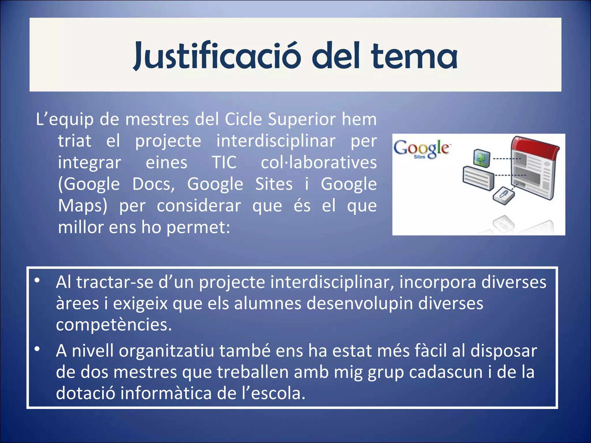 Justificació del temaL’equip de mestres del Cicle Superior hem triat el projecte interdisciplinar per integrar eines TIC col·laboratives (Google Docs, Google Sites i Google Maps) per considerar que és el que millor ens ho permet: Al tractar-se d’un projecte interdisciplinar, incorpora diverses àrees i exigeix que els alumnes desenvolupin diverses competències. A nivell organitzatiu també ens ha estat més fàcil al disposar de dos mestres que treballen amb mig grup cadascun i de la dotació informàtica de l’escola.