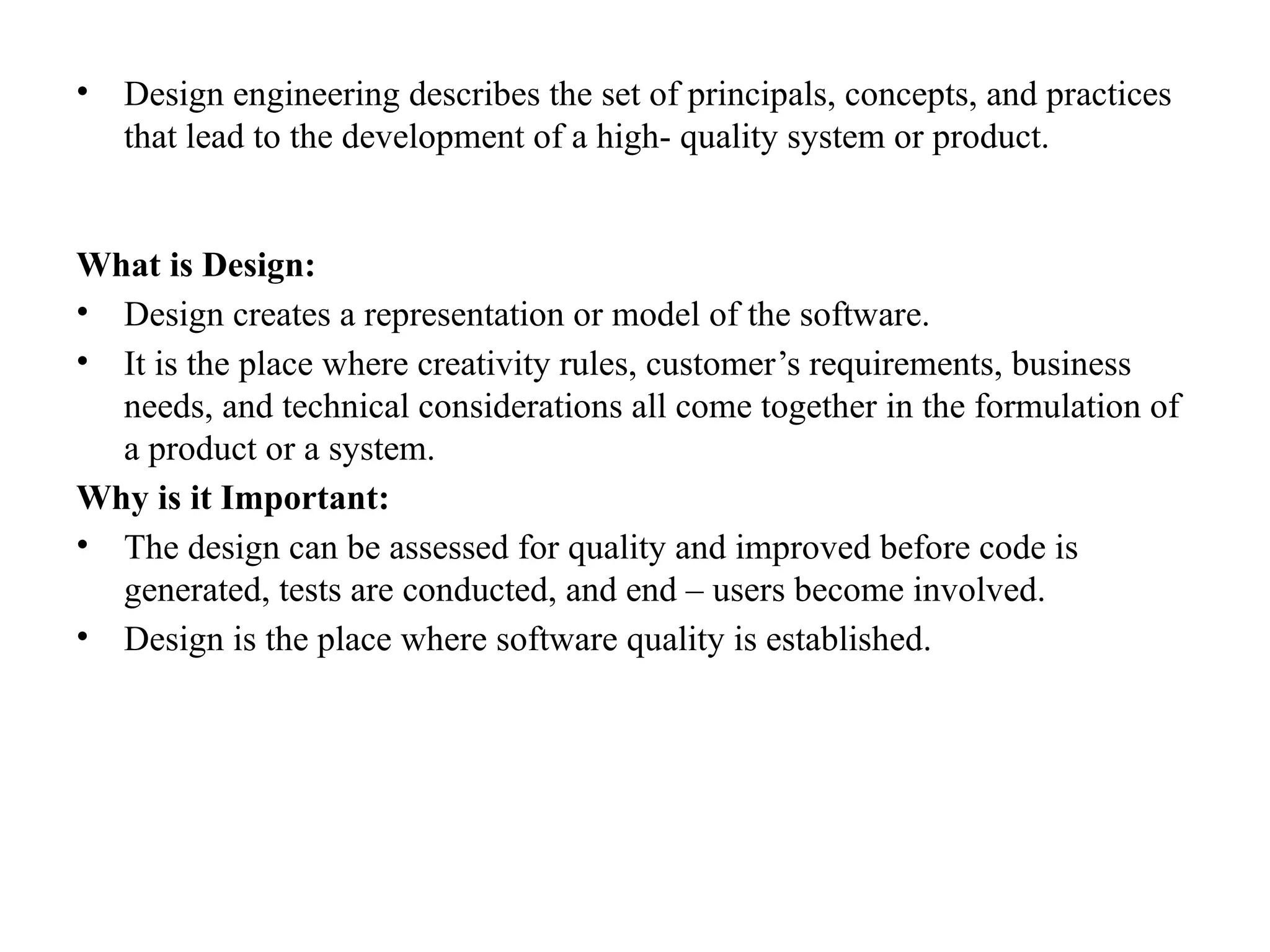 • Design is the place where software quality is established.