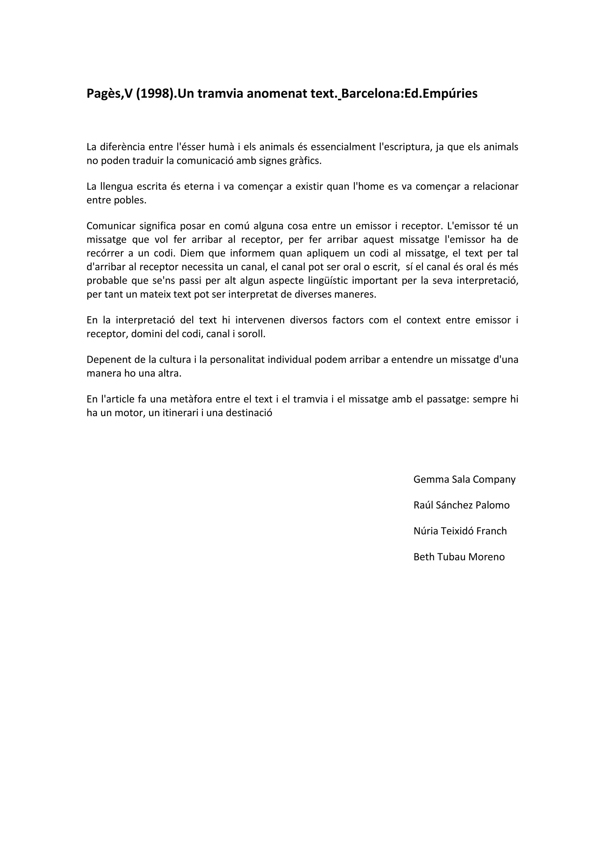 Pagès,V (1998).Un tramviaanomenat text. Barcelona:Ed.Empúries