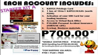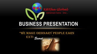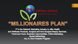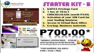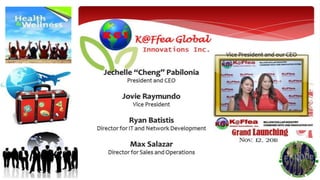 This document provides information about Kaffea Global Innovations, a network marketing business that sells wellness products and provides a financial opportunity. The company was incorporated in 2011 and sells beauty, health, e-loading, and travel products and services. It uses a multi-level marketing model where members can earn commissions from their own sales and the sales of those they recruit. The compensation plan includes bonuses for direct sales, sponsoring new members, sales volume, and building a sales team.