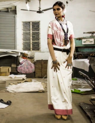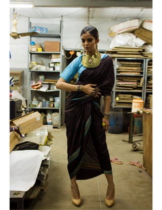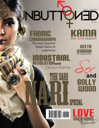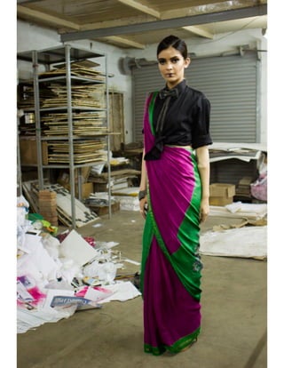 The document discusses the evolution of the Indian sari, exploring its cultural significance and transformation in relation to contemporary fashion. It highlights the integration of traditional garments into modern wardrobes, the impact of Bollywood on sari popularity, and the empowerment of women who embrace their independence. Furthermore, it examines how designers and media influence perceptions of sexuality and heritage in India, particularly through the lens of magazines like 'Unbuttoned'.