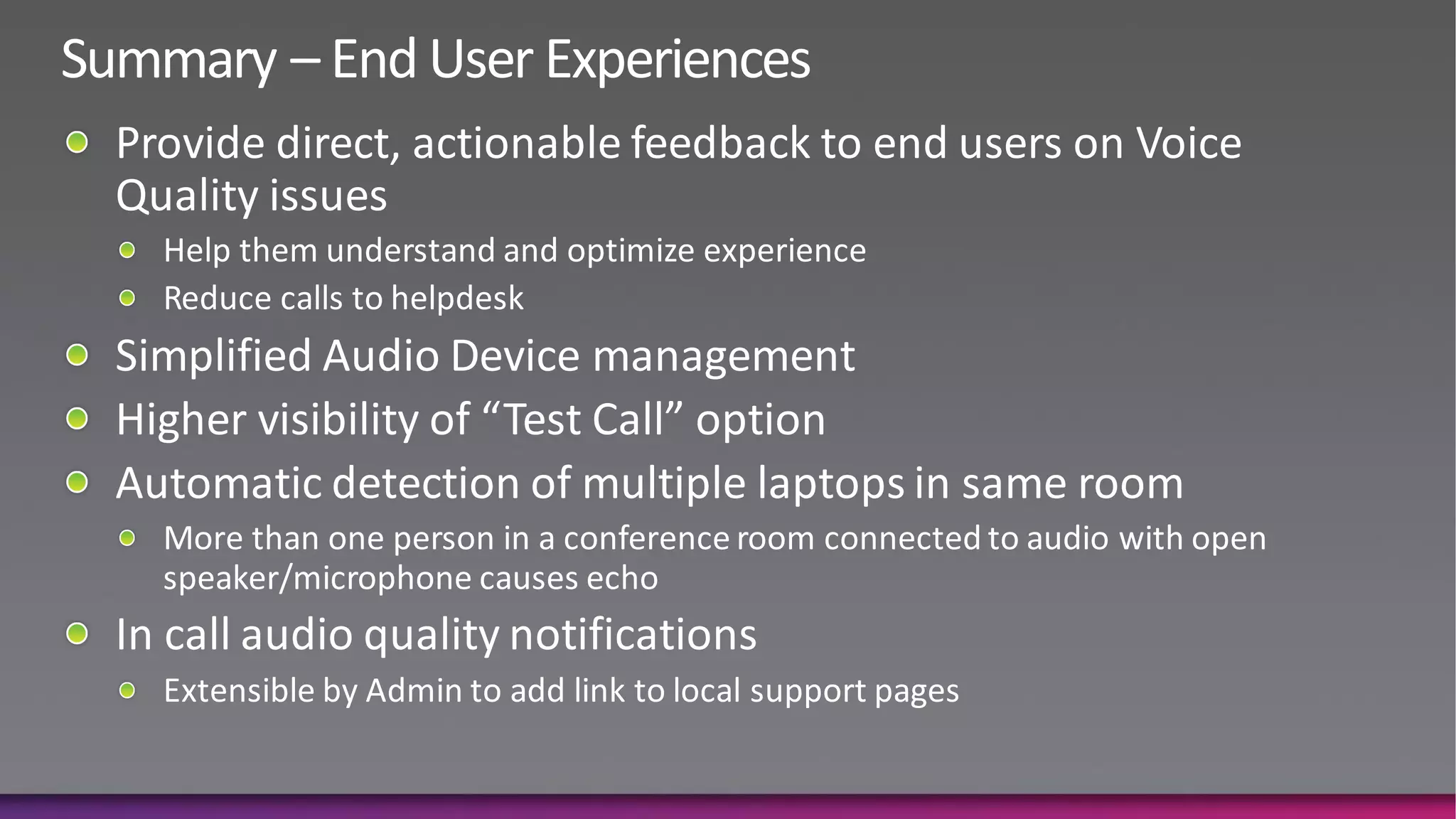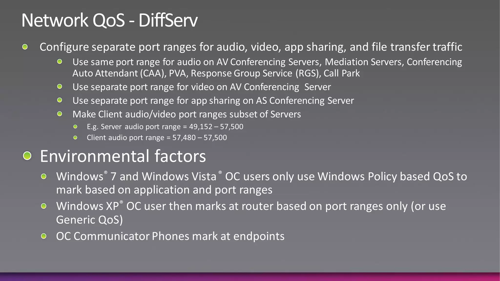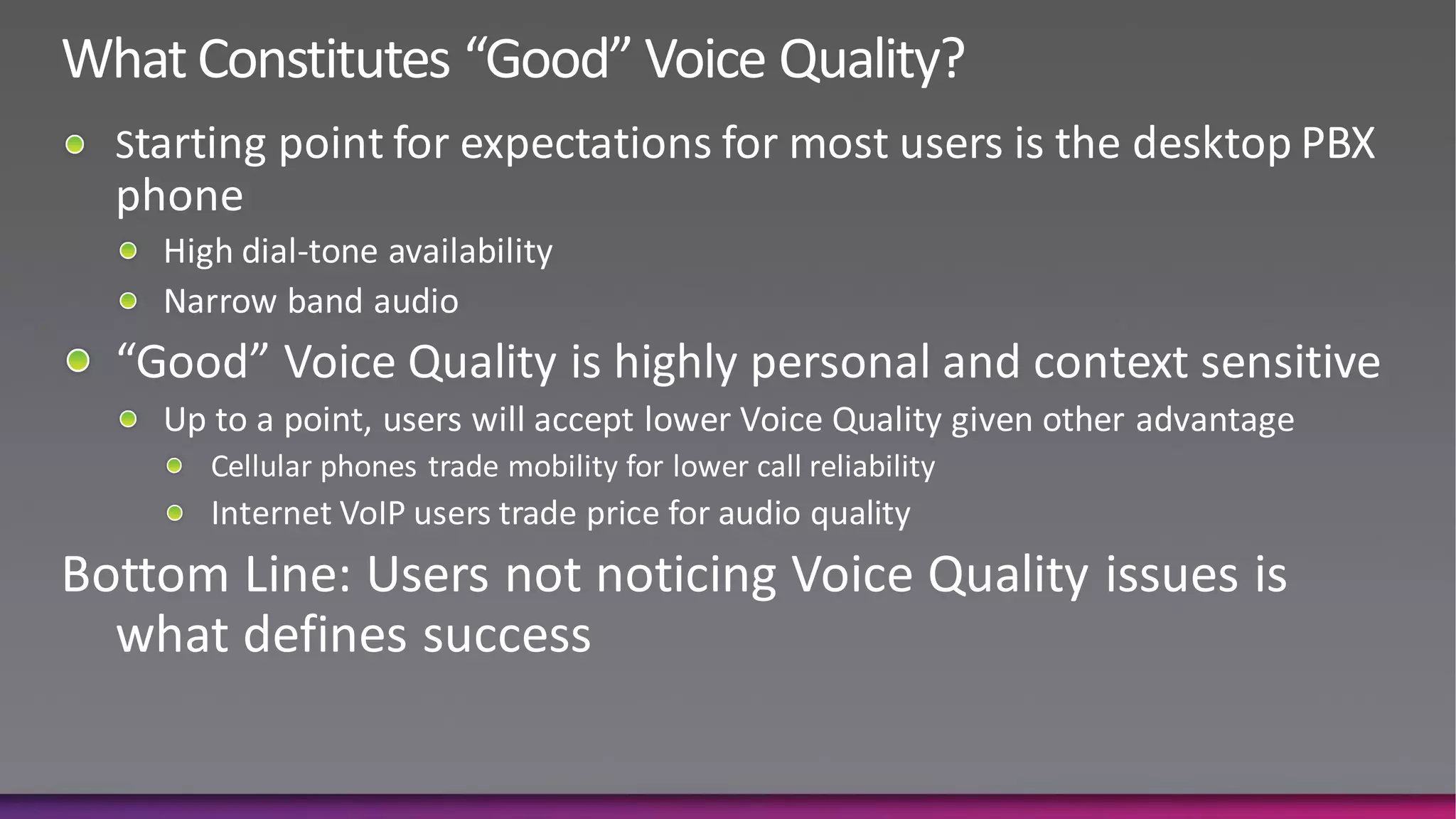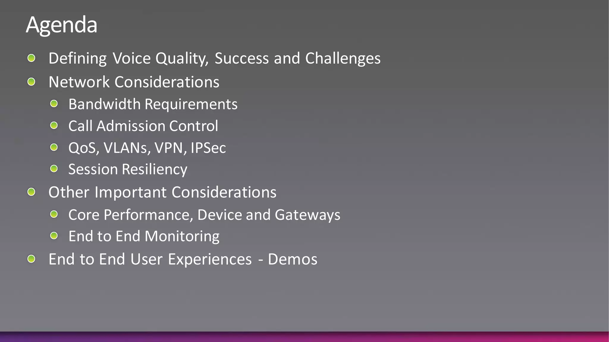 This document discusses voice quality issues in communications systems. It covers various types of voice quality problems like dropped calls, delayed audio, distorted audio, noise, echo, and one-way audio. It then discusses potential root causes like network issues, core performance problems, gateway issues, and device problems. It provides guidance on network considerations like acceptable and optimal values for jitter, packet loss, and latency. It also covers protocols like SIP and SRTP/RTCP. The document includes charts showing bandwidth requirements for different codecs with and without forward error correction. It provides an example scenario for configuring a controlled admission policy for a WAN link. Finally, it lists upcoming training sessions on Communications Server.