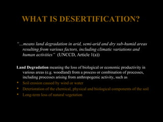 1. The UNCCD aims to combat desertification and mitigate drought effects through long-term strategies. Namibia developed NAPCOD to implement the UNCCD domestically.