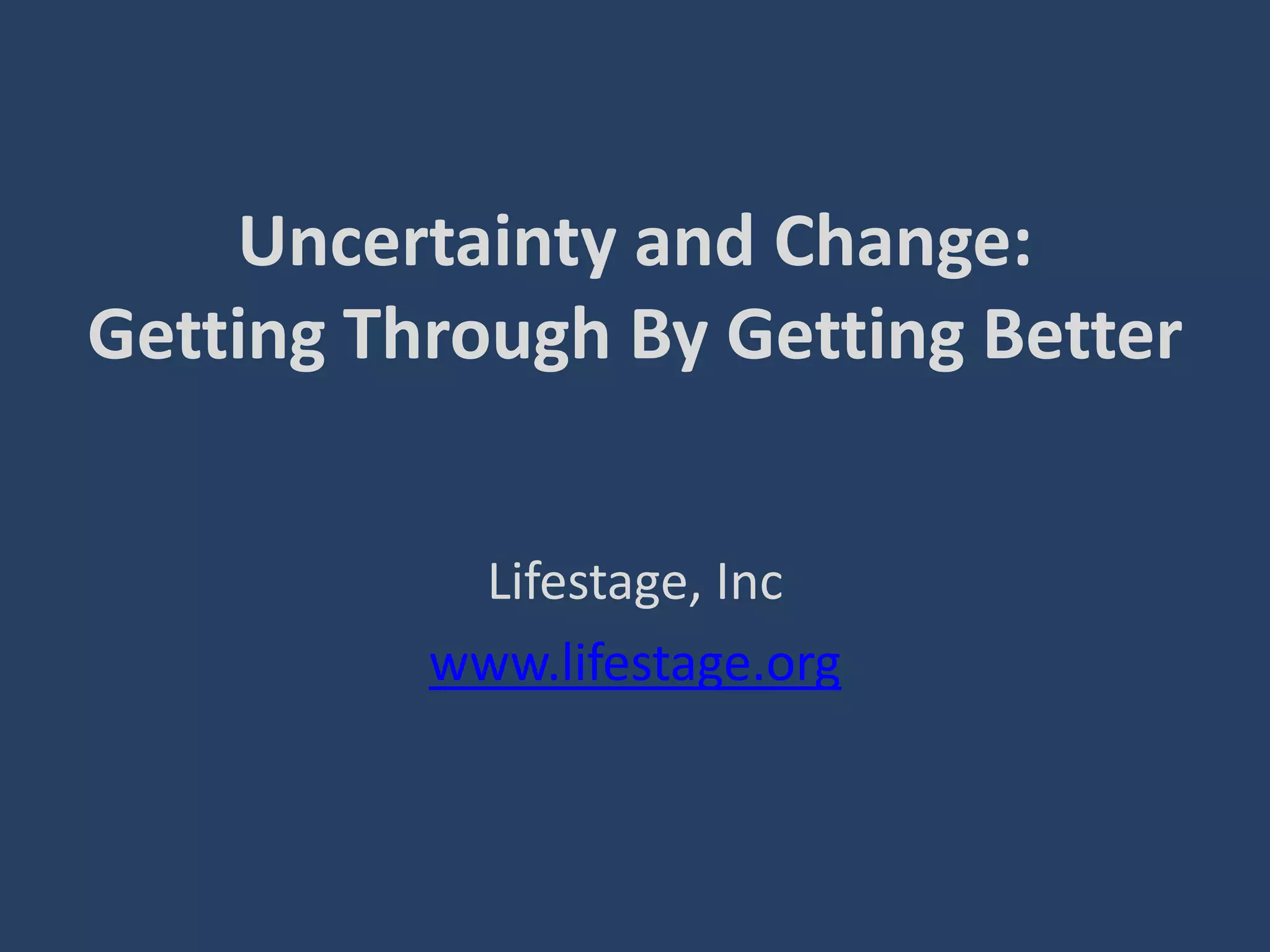 The document discusses the concept of resilience, emphasizing how individuals can develop emotional strength to overcome adversity and change. It highlights the psychological and physiological effects of uncertainty, resilience-building practices, and traits of resilient individuals, such as adaptability and optimism. Ultimately, the content reiterates that resilience is a skill that can be cultivated through various strategies and support systems.