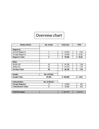 The plan recommends advertising in Outside and Chicago magazines, and on country radio stations WUSN-FM and WEBG-FM. It proposes specific ad sizes, placements, frequencies and costs. Magazine ads will run in Outside once and Chicago three times. Radio ads will air 48 times total on both stations over 12 weeks. The