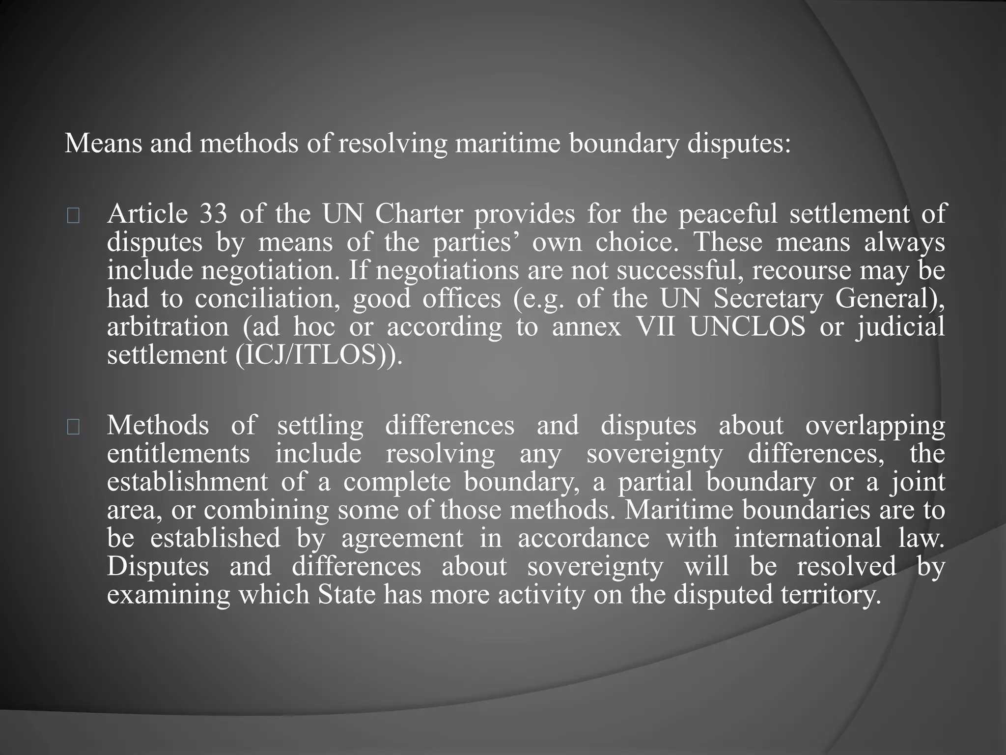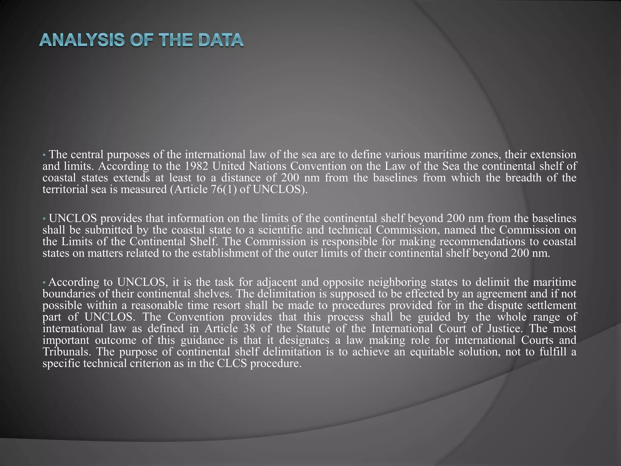 The document discusses international law of the sea as defined by the UN Convention on the Law of the Sea (UNCLOS). UNCLOS establishes that a coastal state's continental shelf extends at least 200 nautical miles from its coastline. For areas beyond 200 nautical miles, UNCLOS created the Commission on the Limits of the Continental Shelf to make recommendations on establishing boundaries. Adjacent states must also agree to delimit boundaries through negotiation or dispute settlement procedures in UNCLOS. The document then provides examples of how China, Iceland, Canada, Denmark, Norway, and Russia have ratified or made claims regarding their continental shelves and boundaries under UNCLOS.