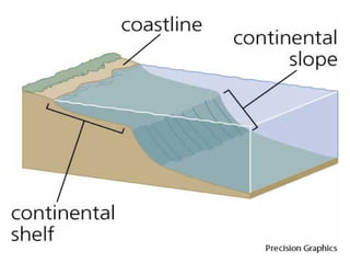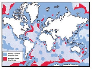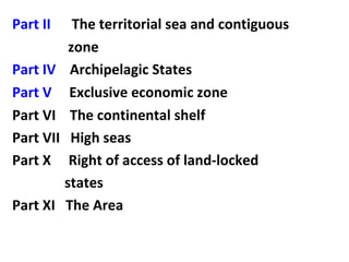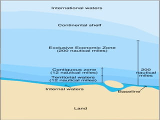 This document summarizes key parts of the United Nations Convention on the Law of the Sea (UNCLOS) 1982. It discusses the territorial sea and contiguous zone, including the sovereignty of coastal states over their territorial sea and airspace above it. It establishes the breadth of the territorial sea at 12 nautical miles and outlines rules for determining baselines and outer limits. It also covers innocent passage of ships through territorial seas, jurisdiction of coastal states, and exclusive economic zones.