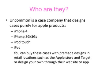 Uncommon is a case company that designs cases for Apple products like the iPhone and iPad. They offer premade designs that can be purchased in stores or customized cases that can be designed on their website, app, or directly from an Apple device. To expand their market, Uncommon needs to advertise to Apple product owners aged 30-45 who are proud of their friends, family, and pets and want to showcase these things in a customized case.