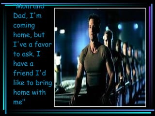 A soldier calls his parents from San Francisco to say he is coming home from Vietnam and wants to bring a friend who was injured, losing an arm and a leg. The parents are reluctant but agree. When the son insists the friend live with them, the father refuses, saying he would be a burden. After hanging up, the son commits suicide. The parents later learn he too had lost a limb. The story illustrates how we often find it easy to love those similar to us but not those different due to inconvenience. God loves unconditionally regardless of flaws.