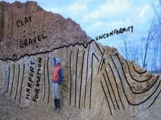 - Unconformities result from tectonic uplift or subsidence causing a period of non-deposition. The main types are non-conformities between igneous/metamorphic and overlying sedimentary rock, disconformities where parallel sedimentary layers have an erosional contact plane, and angular unconformities where the layers have different angles.