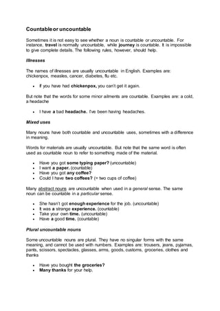 Uncountable or mass nouns refer to materials, liquids, abstract qualities, and collections that cannot be counted individually. Examples include wheat, sand, weather, and water. Uncountable nouns are singular and do not take plural forms or numbers. Some nouns like travel can be either countable or uncountable depending on whether they refer to a specific instance or the concept in general. Additionally, some nouns like scissors are always plural even though they refer to a single object.