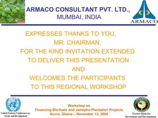 This document discusses the potential for biofuels in Africa based on lessons from India's biofuels industry. It outlines the key drivers for biofuels including energy security, climate change mitigation, and rural development opportunities. The document also discusses financing challenges and opportunities for biofuels projects, as well as the roles of various stakeholders including governments, farmers, and private industry. Overall, the document advocates for Africa to develop a strategic approach to biofuels to help meet development goals like those outlined in the Millennium Development Goals.