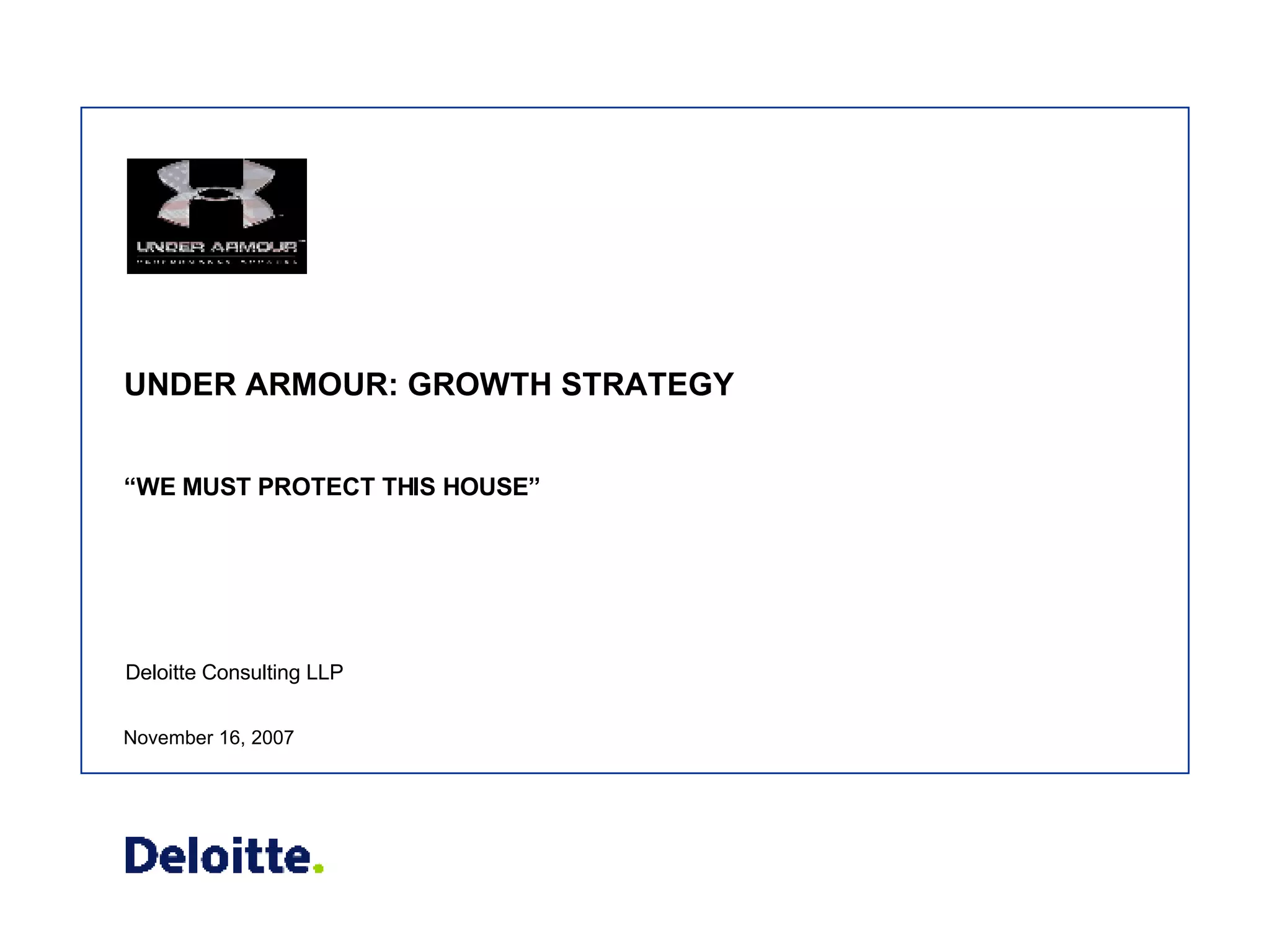 The document proposes that Under Armour acquire Columbia Sportswear to quickly expand its product offerings and strategically position itself in growing international markets. It analyzes the athletic apparel industry, identifying opportunities for growth. The document recommends that Under Armour acquire Columbia to preserve its brand equity while allowing for expansion into new product segments and geographic markets. It asserts that the acquisition would meet Under Armour's goals of organic growth and international expansion.