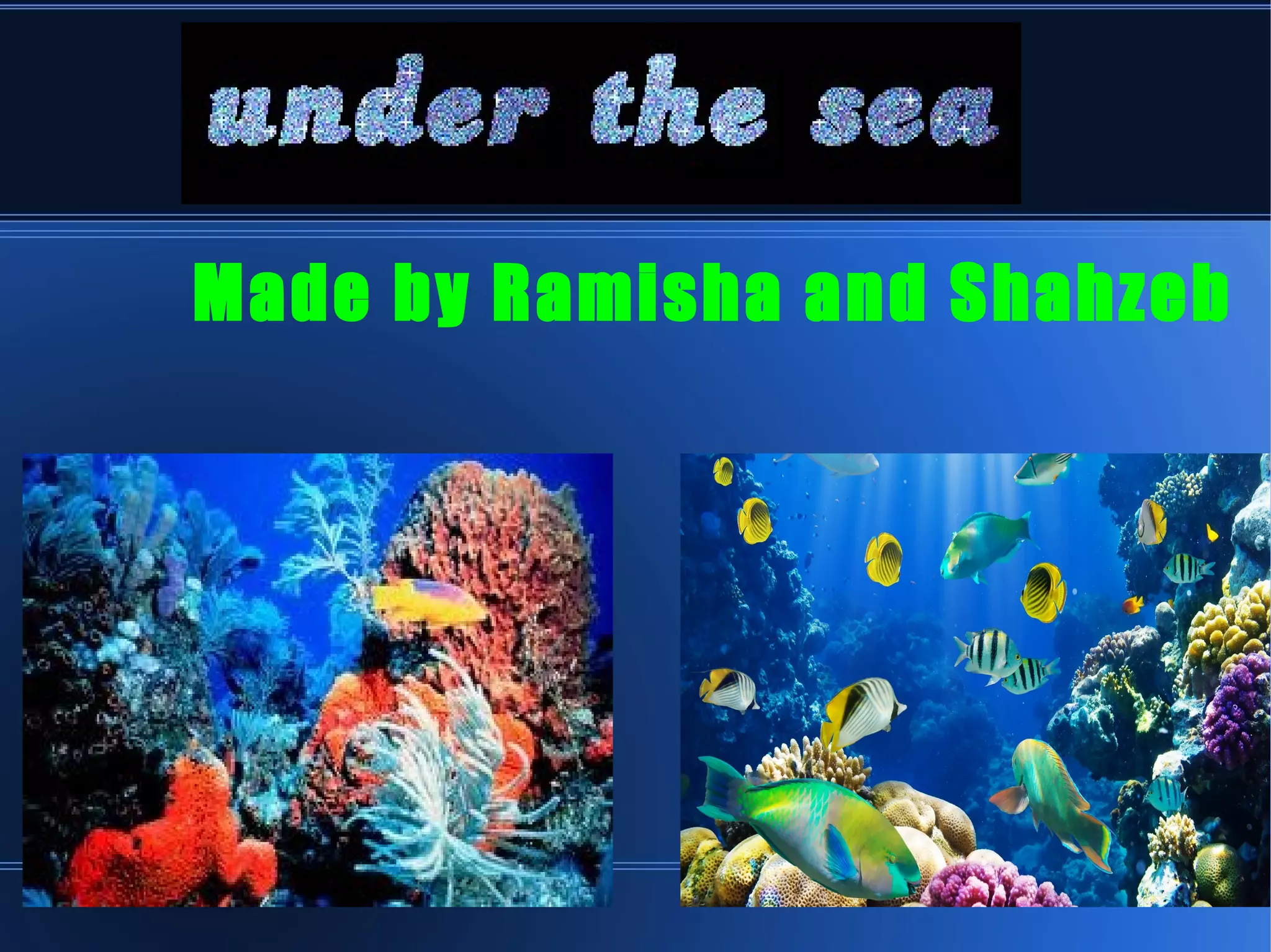 There are over 5,000 underwater volcanoes that exist in various sizes, both under deep and shallow water. Shallow water volcanoes can erupt and throw magma onto nearby land areas. Coral reefs are formed over many generations as young coral attaches to old calcium carbonate skeletons left behind when coral dies, building up large structures over time like the Great Barrier Reef. Sharks have existed in oceans for over 400 million years and evolved into 440 different species with excellent senses that make them skilled predators. Seahorses have a unique body structure where their lower body is a curled tail and upper body resembles a horse, with 30 identified species. Dolphins come in 32 unique types based on color and body