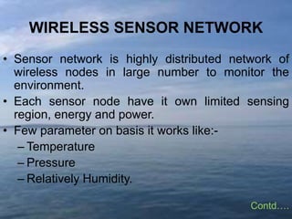 Wireless sensor networks (WSNs) consist of distributed nodes for environmental monitoring, incorporating various sensors and subsystems for processing and communication. Key design factors include fault tolerance, scalability, production costs, hardware constraints, and environmental conditions, which affect node functionality. The document also explores underwater sensor networks, emphasizing the challenges and potential applications in ocean observation and resource monitoring.