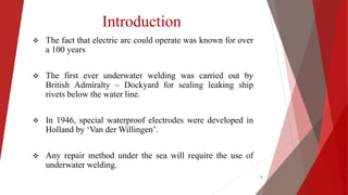 Underwater welding, first introduced by the British Admiralty, is a crucial method for repairing structures beneath water, utilizing electrical arcs for joining metals. The process includes wet welding, performed directly in water, and dry welding, which occurs in a controlled gas environment. Despite its efficiency and necessity for high-pressure applications, underwater welding poses risks such as electric shock and gas explosions, requiring strict safety precautions.