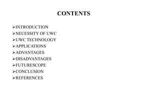 This document summarizes a technical seminar report on underwater wireless communication. It introduces the topic, discusses the necessity of underwater wireless communication due to limitations of wired systems. It describes the technology used, including the use of acoustic waves instead of radio frequencies. It covers influencing factors, hardware interfaces, acoustic modems, underwater acoustic sensor networks and their applications. It discusses advantages like pollution monitoring, and disadvantages like limited bandwidth and power. It concludes more research is needed to address limitations and future applications may include improved audio and video transmission.