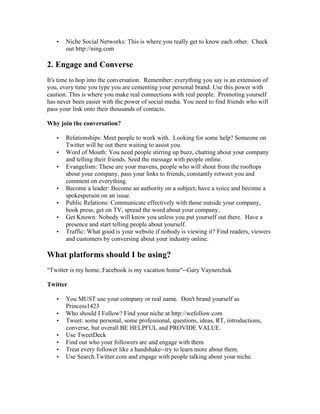 Social media allows people and companies to connect with others online faster than through traditional networking. To succeed, one must listen to conversations in their industry, engage and converse with others, and promote their brand across multiple social media platforms. Key steps include learning where your industry community discusses topics online, engaging in conversations on platforms like Twitter and Facebook, developing relationships, and automating promotion of your brand using tools like Ping.FM. The goal is to become known as an authority and leader in your niche by providing value to others.