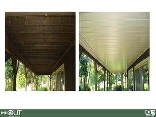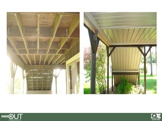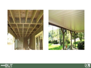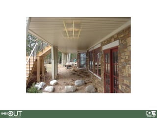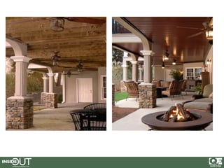 The document discusses the significant market for outdoor living spaces in the U.S., highlighting that 107 million homes have decks or porches. It presents statistics on remodeling costs and emphasizes the importance of creating visually appealing indoor-outdoor transitions to enhance living space value. Additionally, it outlines contractor success factors and homeowner preferences in remodeling decisions, with a focus on personal taste.