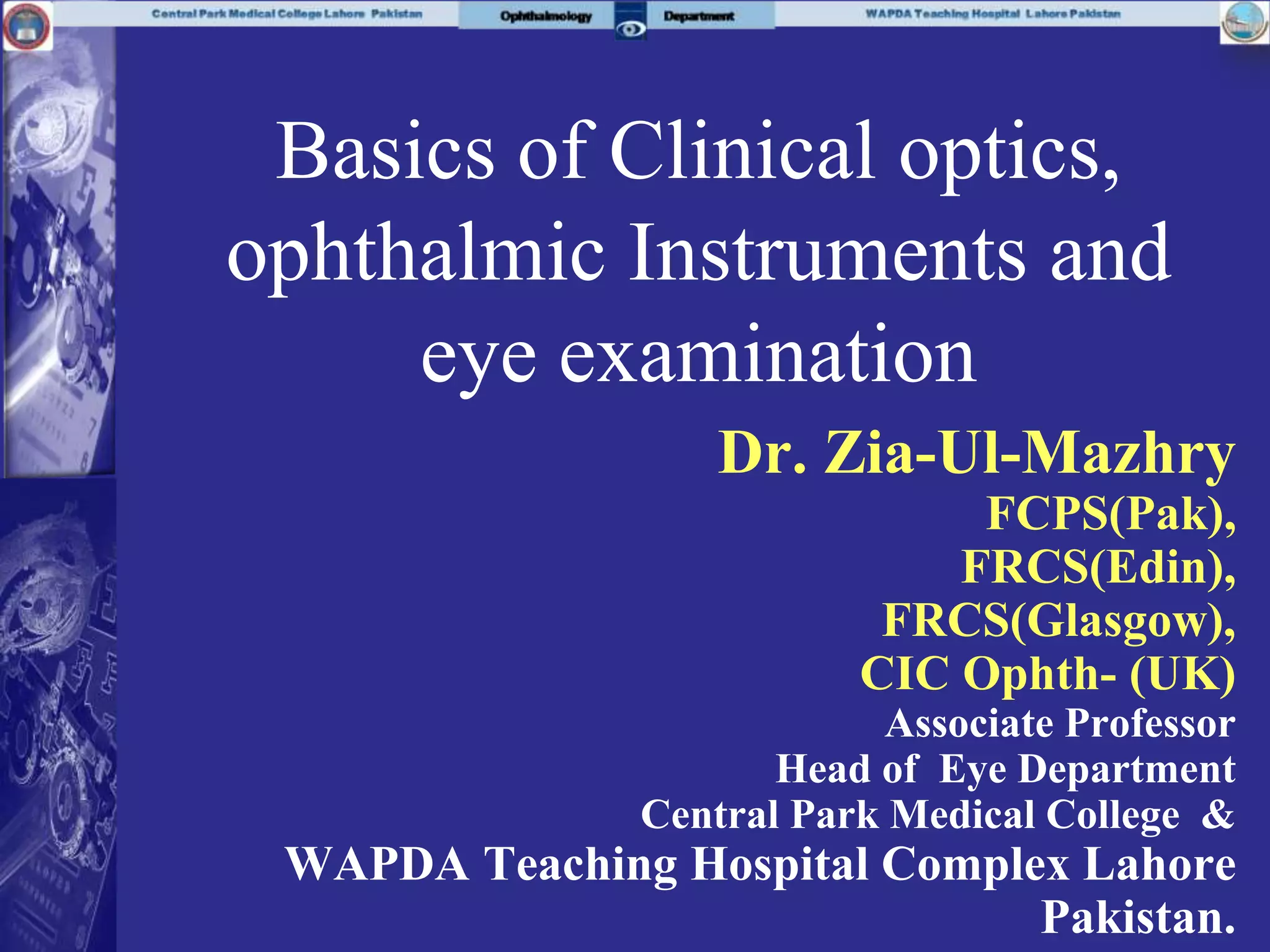 The document provides an extensive overview of clinical optics, ophthalmic instruments, and eye examination techniques, presented in multiple structured parts. It covers the importance of clinical optics in ophthalmology, the use of various instruments for eye examinations, and includes pretests and questions to assess understanding of key concepts. The main objectives are to enable students to understand clinical optics, utilize ophthalmic instruments, and evaluate common ocular conditions effectively.