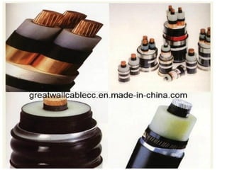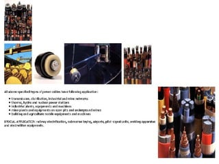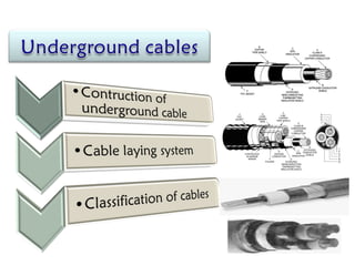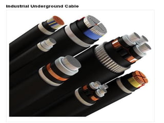 Underground cables have several advantages over overhead cables including better appearance, reduced damage from external factors like storms and lighting, lower maintenance costs, and fewer faults. Underground cables consist of one or more insulated conductors surrounded by protective layers. Key components include the conductor, insulation like paper or rubber, a metallic sheath, bedding, armor for protection, and an outer serving. Different types are used for various voltage applications up to extra high voltage cables over 33kV. Selection depends on factors like the number of cores needed, insulation material, and whether solid or pressure cables are required.