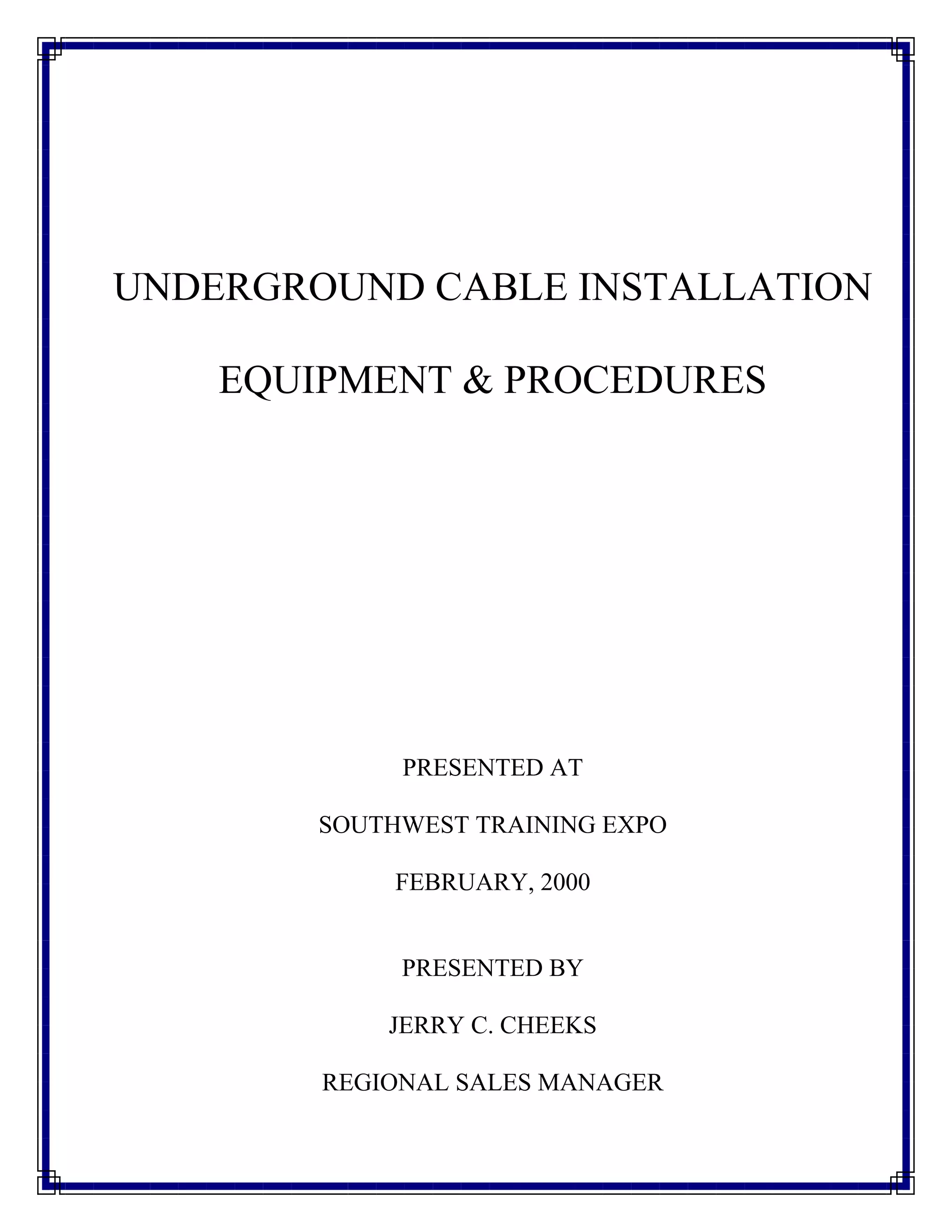 The document discusses equipment and procedures for underground cable installation, focusing on total conduit systems. It outlines key areas for consideration like trench preparation, conduit selection, pulling equipment, reel trailers, rigging, and lubrication. A total conduit system protects cables as they lie in trenches, extending their life. Proper preparation, equipment sized for the job, and lubrication are essential for safe, reliable installation.
