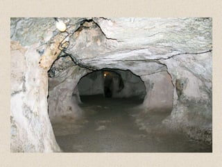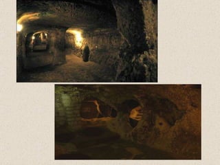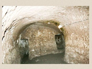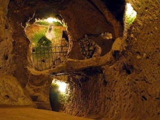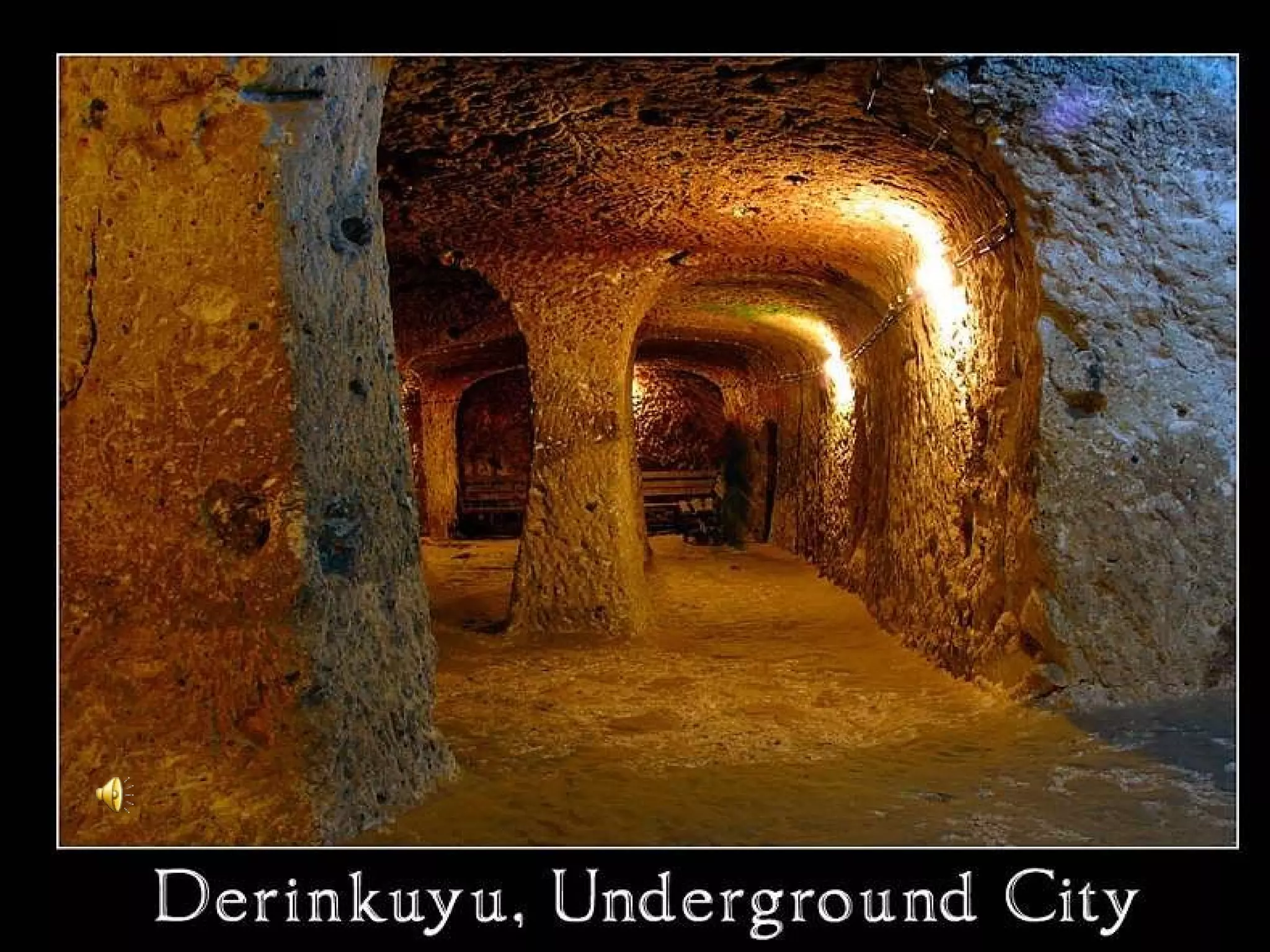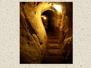 An inhabitant of Derinkuyu, Turkey discovered a mysterious room behind a wall in his house, which led to the discovery of an extensive underground city used for shelter. Archaeologists have uncovered 20 levels extending over 80 meters deep, with space for at least 10,000 people. The city included features like stone doors to block passages, tunnels to other cities, stables, kitchens, wells, and more, allowing inhabitants to live underground protected from frequent invasions on the surface.