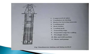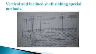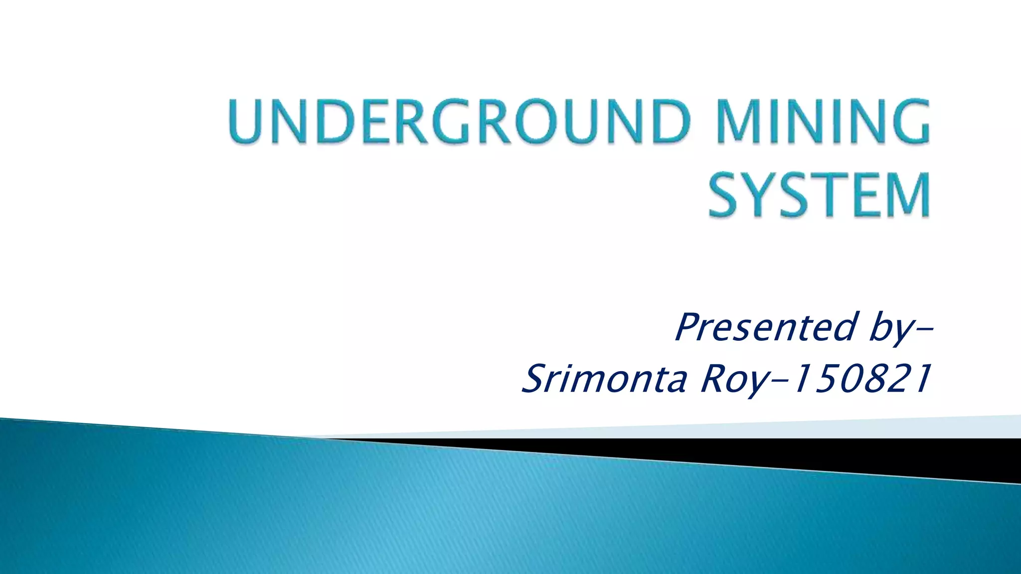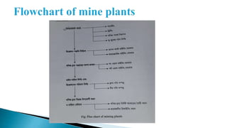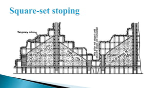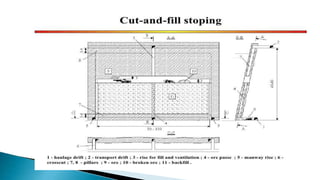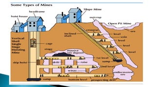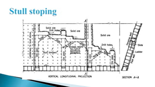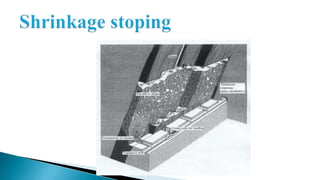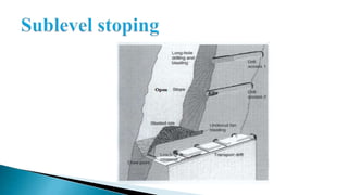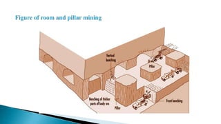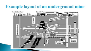 The document provides an overview of underground mining methods. It discusses room and pillar mining, which involves cutting rooms into coal beds and leaving pillars for support. This method is well-suited for flat, narrow deposits. Stope and pillar mining and shrinkage/sublevel stoping are also described. The document outlines various mining equipment used including hand tools, power tools, excavators, and machinery for hauling, loading, and transporting minerals. Factors for selecting a mining method and planning mine development are also summarized.