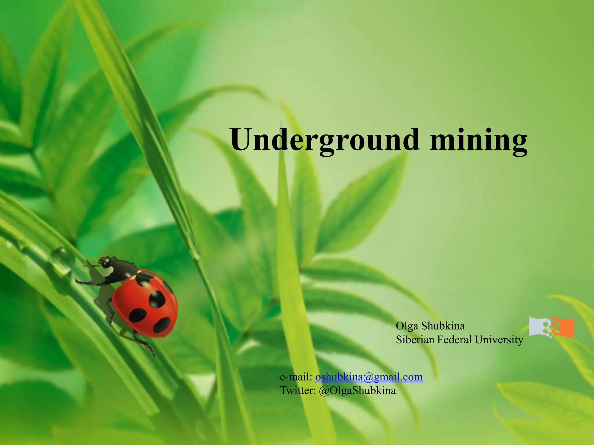 Underground mining involves extracting rocks, minerals, or gemstones located too deep below ground for surface mining. There are several types of underground mining including borehole mining, drift mining, hard rock mining, shaft mining, and slope mining. Borehole mining uses drilled holes to break up material with water and pump it to the surface. Drift mining extracts material from horizontal tunnels dug into mountainsides. Hard rock mining uses vertical shafts and horizontal tunnels. Shaft mining uses vertical shafts to transport workers, equipment, and extracted material. Slope mines have slanted shafts to access deep, flat deposits. Common underground mining machinery includes dump trucks, shuttle cars, continuous miners, and longwall equipment.