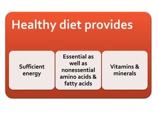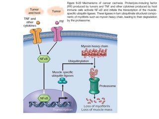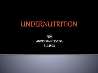 This document discusses different types of malnutrition including primary and secondary malnutrition. It describes the clinical syndromes of marasmus and kwashiorkor that represent the two extremes of protein-energy malnutrition (PEM). Marasmus is characterized by loss of muscle and fat mass while kwashiorkor presents with edema and skin changes. Anorexia nervosa, bulimia, cachexia and starvation are also summarized as forms of self-induced malnutrition.
