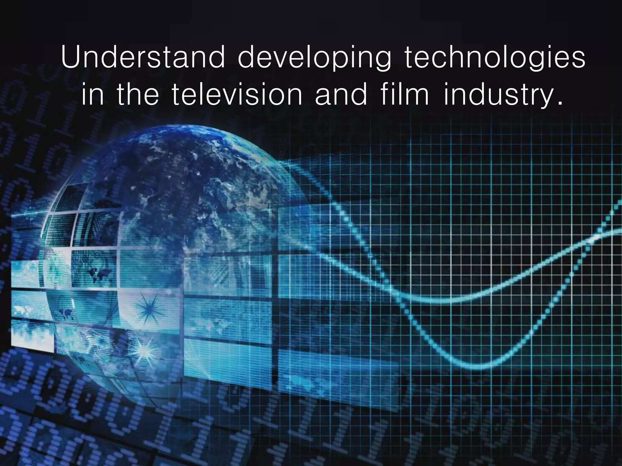 The document discusses various technologies used in the television and film industries for producing and distributing media content. It covers consumer products like cameras and editing software, methods of transmission like satellite and cable, standards like analog and digital signals, platforms for consumption like broadcast, internet and on-demand streaming, and technologies like high-definition, 3D, pay-per-view and digital recording. Recent trends include higher resolutions, online streaming and on-demand viewing allowing consumers more control over what and when they watch.