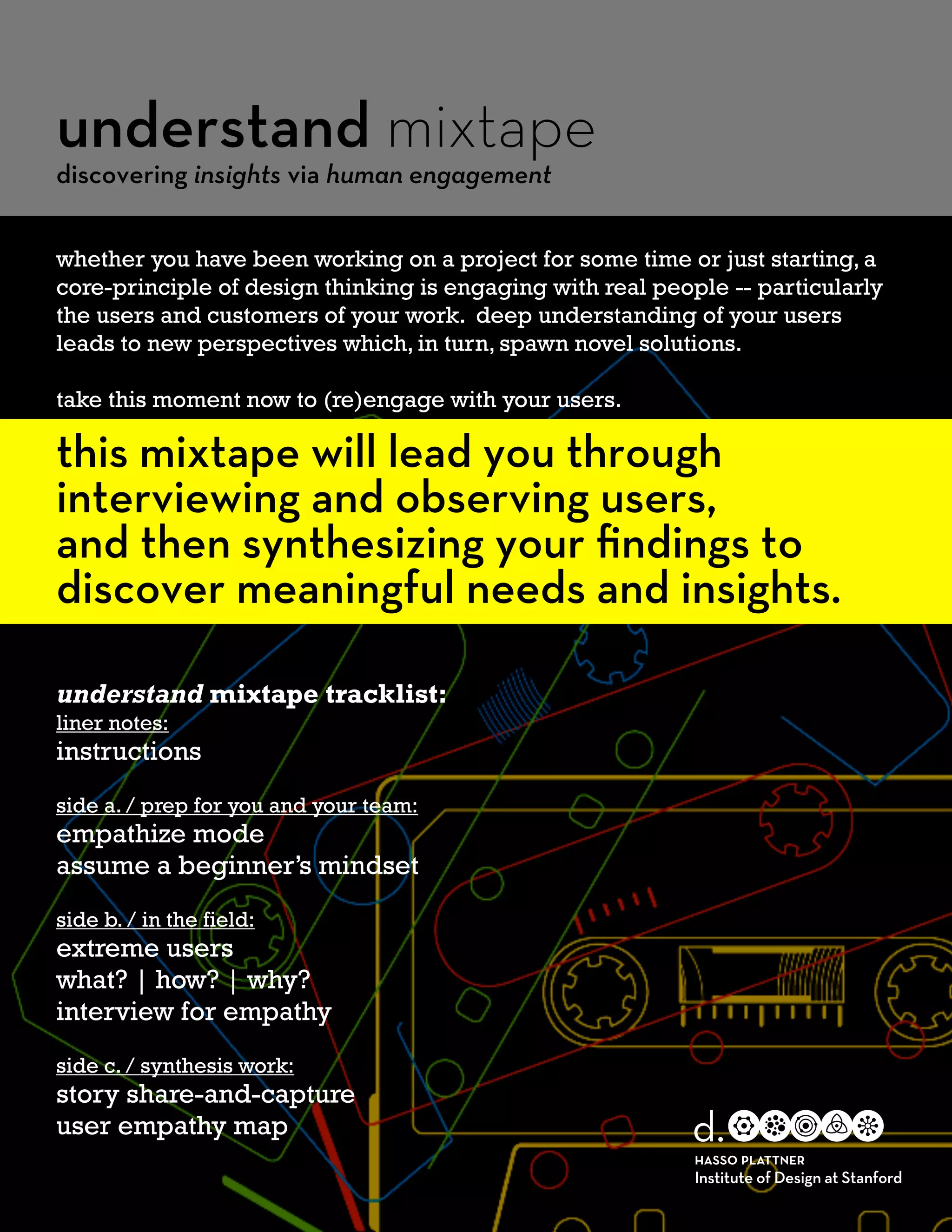 This document provides instructions for conducting user research through interviews and observations to gain empathy and insights. It outlines an 8-step process: 1) Prepare your team and schedule time for research. 2) Frame the work in a human-centered way focused on understanding users. 3) Launch the research with an energizing activity. 4) Conduct interviews and observations in the field. 5) Share findings visually and note tensions. 6) Synthesize insights and unexpected needs. 7) Recap learnings and plan next steps. 8) Integrate insights into the project and consider further ideation. The goal is to engage with real people, particularly target users, to gain new perspectives that can inspire novel solutions through a deeper understanding of user