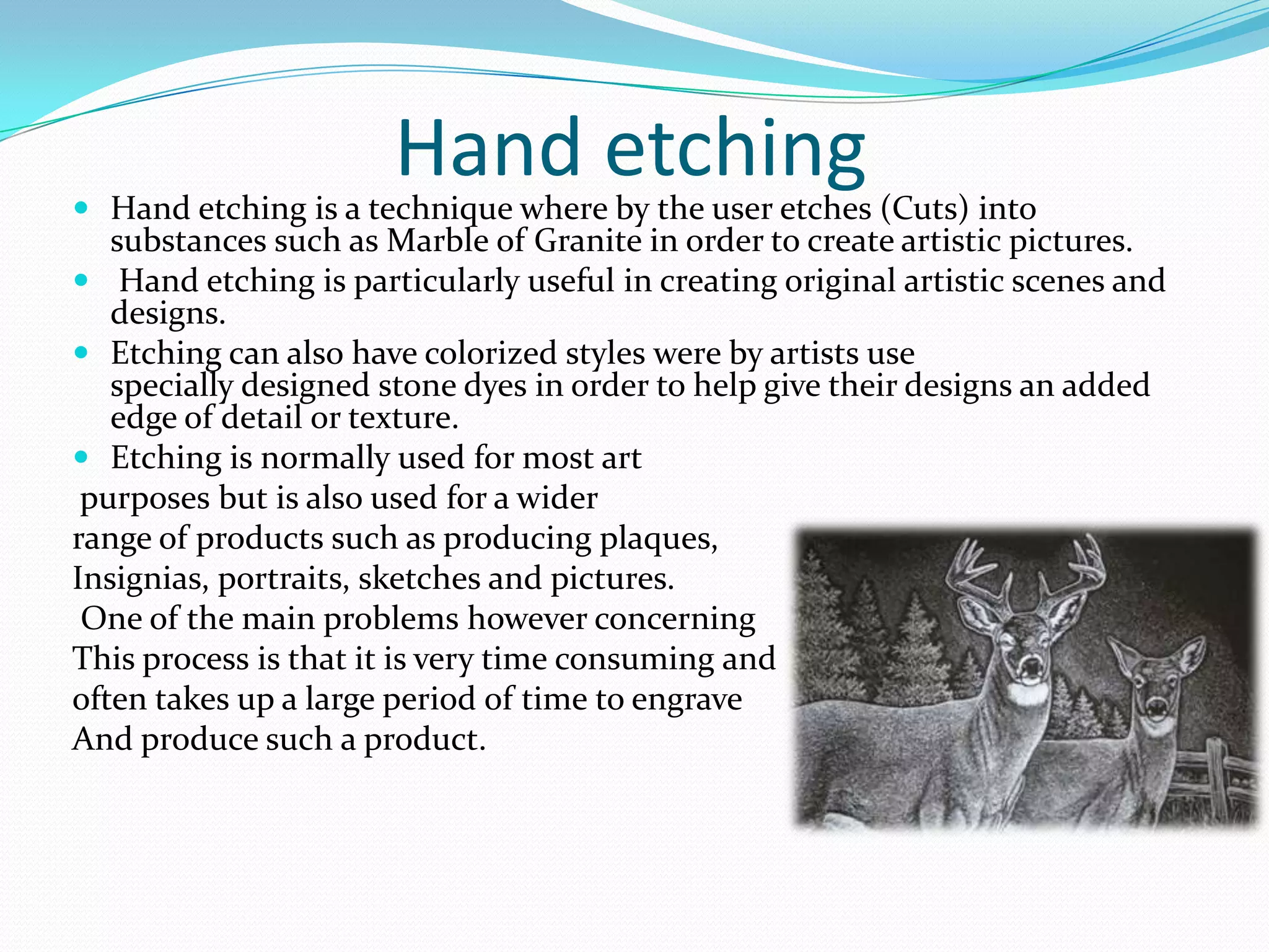 The document discusses several printmaking techniques including hand etching, linocut, screen printing, lithography, letterpress, digital photography/printing, laser printing, inkjet printing, and photocopying. Hand etching and linocut involve manually cutting into materials like marble or linoleum to create designs, while screen printing uses a woven mesh screen to transfer ink in selective areas. Lithography and letterpress are older techniques that transfer images using oil/wax or raised surfaces, respectively. Modern digital methods like inkjet and laser printing deposit ink via controlled droplets or laser beams.