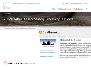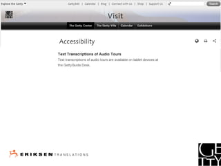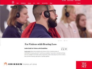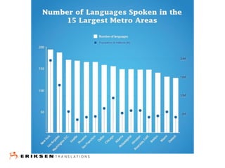 The document discusses translation services and accessibility programs, emphasizing the need to repurpose standard language services and translate specific accessibility offerings. It provides statistical data on the languages spoken at home in major U.S. metro areas, highlighting the diverse linguistic landscape. In conclusion, while acknowledging progress, it encourages continued efforts in enhancing access and support.