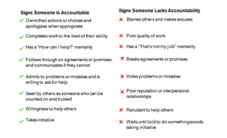 Accountability involves taking ownership of results and comes after completing responsibilities, which are defined by individual obligations. Effective leadership in accountability is crucial, as accountable leaders model the behavior expected from their teams, fostering trust and collaboration. Despite challenges, demonstrating accountability as a leader promotes a culture where employees are motivated to take responsibility for their actions.
