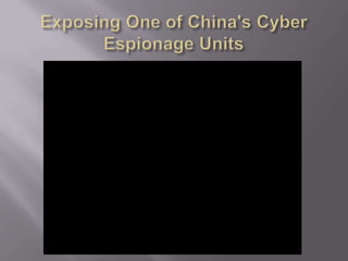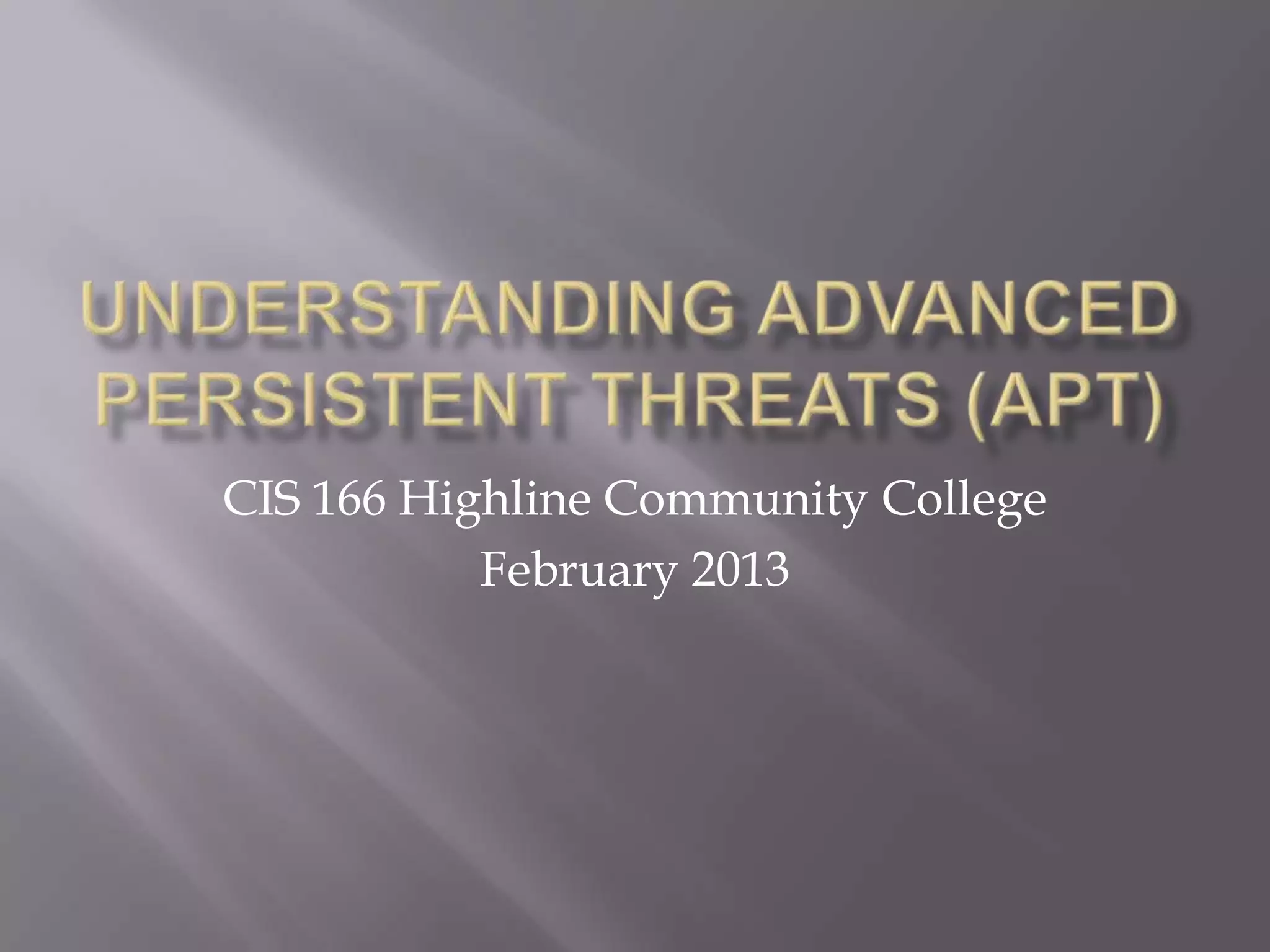 The document discusses advanced persistent threats (APTs) and signs that an organization may have been targeted by an APT. It defines APTs as sophisticated cyber threats, often foreign governments, that target specific entities over an extended period of time. The summary then lists five signs that an APT attack may be occurring: 1) an increase in elevated logins late at night, 2) widespread backdoor Trojans being installed, 3) unexpected information flows within the network, 4) discovery of unexpected large data bundles, and 5) detection of pass-the-hash hacking tools.