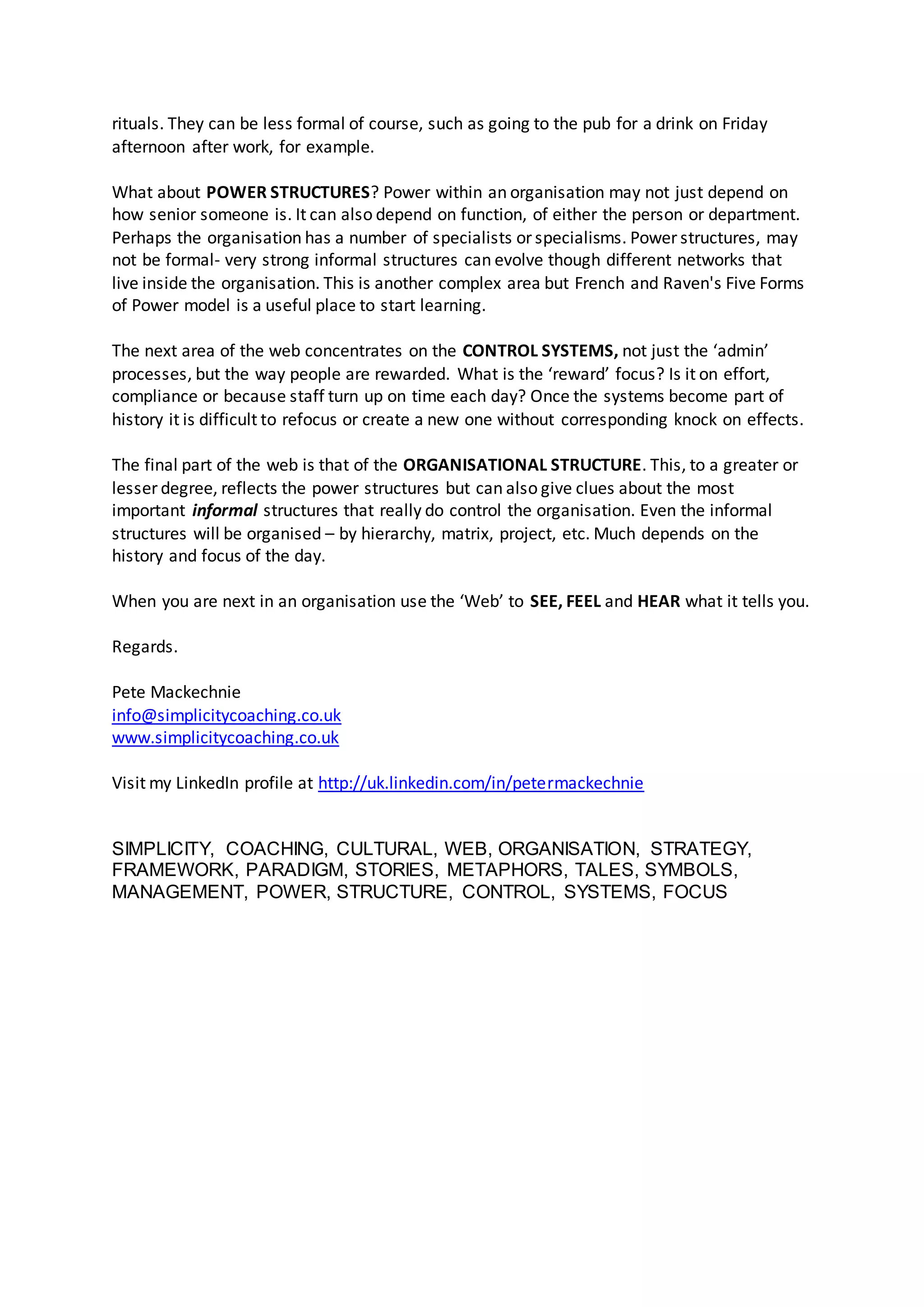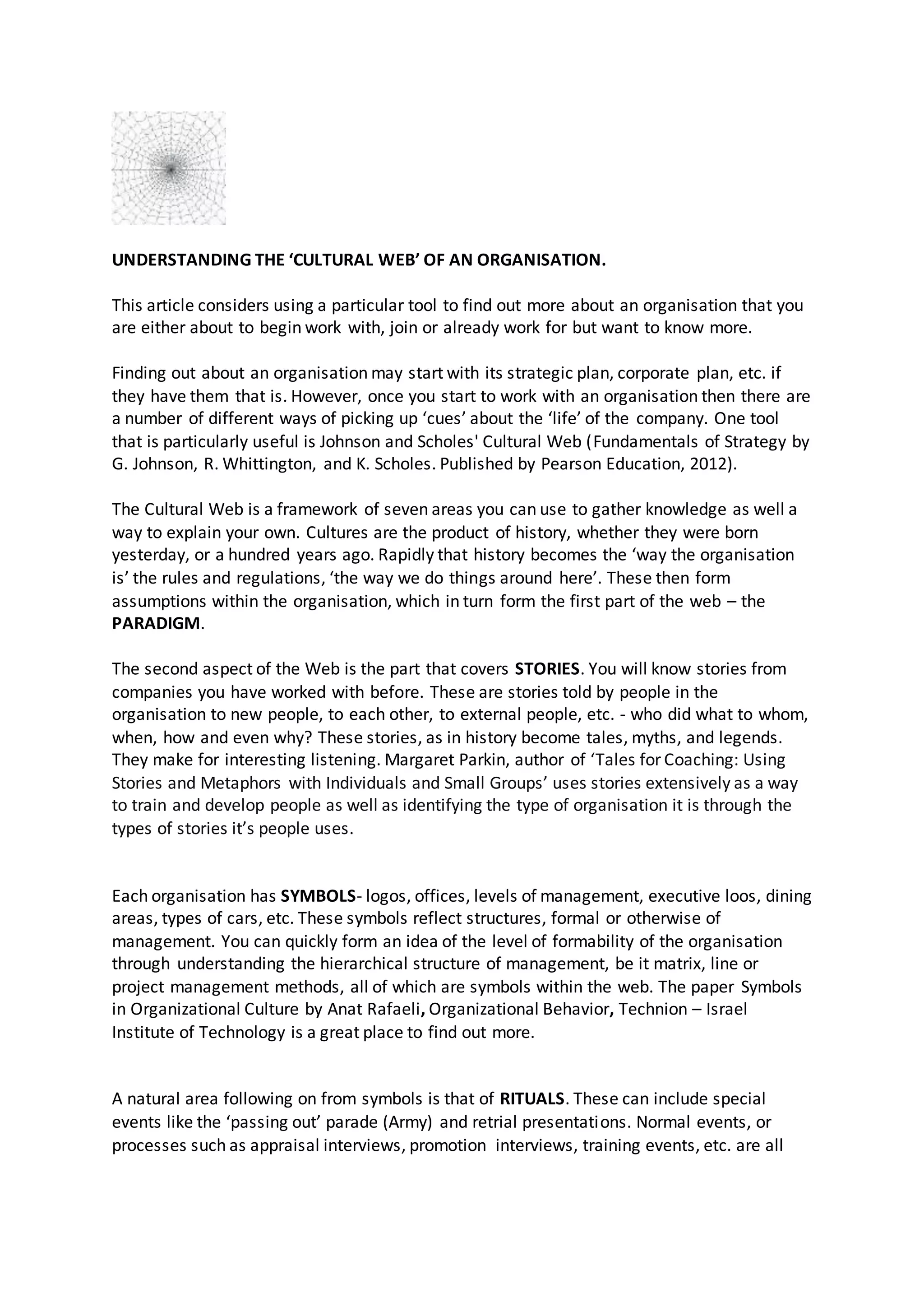 The article discusses the concept of the 'cultural web' of an organization, focusing on a framework by Johnson and Scholes that helps individuals understand the underlying cultural elements of an organization. It emphasizes the importance of history, stories, symbols, rituals, power structures, control systems, and organizational structure, which all contribute to the organization's culture. The cultural web serves as a tool for both newcomers and existing employees to gain insights into the organization's dynamics and values.