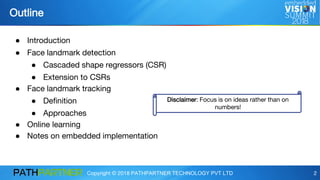 The document discusses face landmark detection and tracking, emphasizing its importance in various applications like facial recognition and human-computer interaction. It outlines different approaches including cascaded shape regressors and highlights the challenges faced due to varying face appearances, such as illumination changes and occlusions. The text also introduces advanced methodologies like Global Supervised Descent Method and Mnemonic Descent Method to improve landmark detection performance.