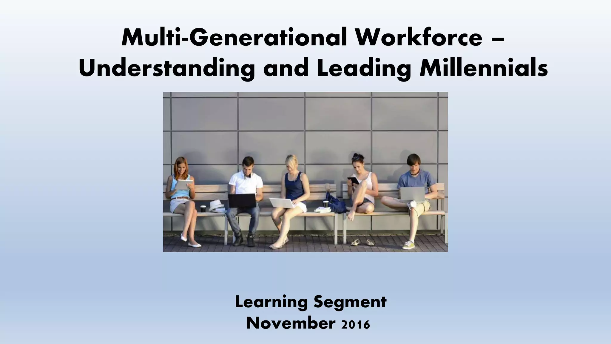 This document discusses the characteristics and needs of millennials in the workforce, comparing them with previous generations. It highlights the perception versus reality of millennials, addressing challenges they face and providing strategies for effective leadership. Recommendations include offering flexibility, recognition, clear expectations, and meaningful engagement in their work.