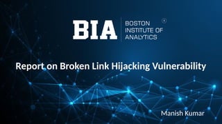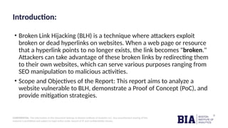 The document reports on broken link hijacking (BLH), a web security vulnerability where attackers exploit inactive hyperlinks to redirect users to malicious sites. It includes a case study on a specific website, example.com, and presents mitigation strategies, emphasizing the need for regular link maintenance and monitoring. The findings highlight the potential impacts of BLH, including reputational damage and legal consequences, and advocate for proactive measures to enhance web security.