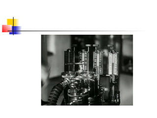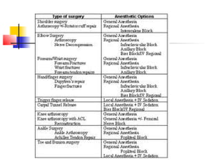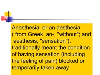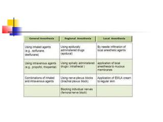 Anesthesia is a medical process where sensation and awareness are temporarily reduced or lost. There are several types including local, regional, spinal/epidural, general, and dissociative anesthesia. Local anesthesia blocks sensation in a specific area while general anesthesia induces a state of unconsciousness. Common agents for general anesthesia include inhalational gases, intravenous medications like propofol and opioids, and muscle relaxants. Proper administration and monitoring during anesthesia aims to balance pain relief with safety.