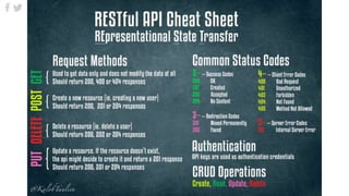 The document discusses APIs and RESTful APIs. It defines an API as an interface that allows computers to communicate with each other, and compares it to a waiter relaying orders between the kitchen and customers. RESTful APIs use HTTP requests like GET, POST, PUT, and DELETE to perform CRUD (create, read, update, delete) operations on resources identified by URLs. Most APIs use API keys for authentication and return responses in JSON or XML format along with HTTP status codes.
