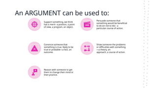 An argument is a structured presentation of ideas aimed at supporting a position, persuading an audience, or demonstrating a fact. It consists of a claim, supporting evidence, and underlying warrants that connect the claim and support. The document also outlines the components of an effective position paper and offers guidelines for presenting arguments in a well-organized manner.